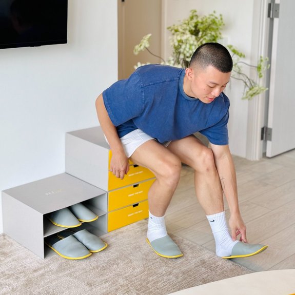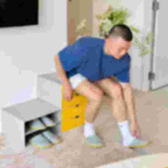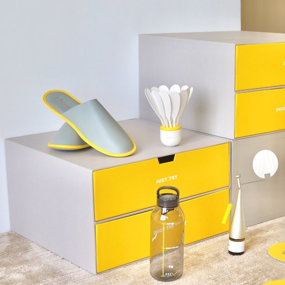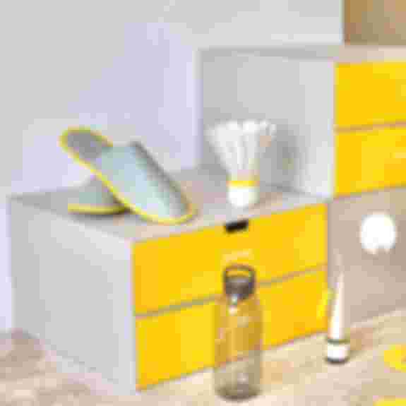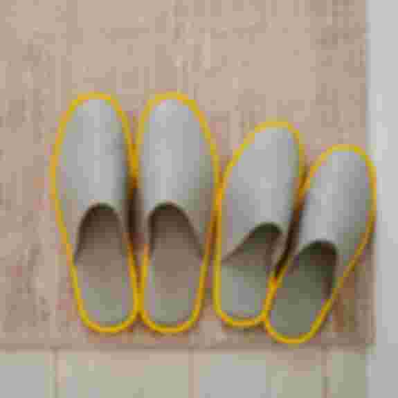 德築與林果良品共同籌備近八個月的品牌聯名合作拖鞋,致力推廣皮革工藝到居家生活場域,讓每個人回到家就能擁有品味設計和工藝美學、體驗生活的美好。獨家開發的手工牛皮拖鞋,是一雙帶有活力黃與建築灰的配色,在其縫邊縫線上更是呈現德築在建築設計上也很重視「縫」的顏色跟粗細比例,將細節發揮的淋漓盡致。